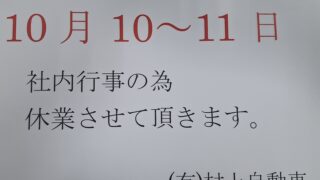10月10日(金)~10月11日(土)社内行事の為、臨時休業とさせていただきます。ご不便をおかけしますが何卒よろしくお願いいたします。